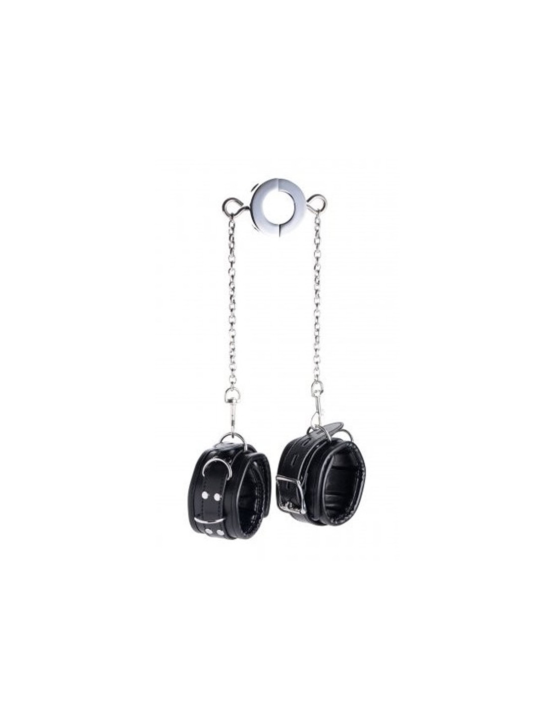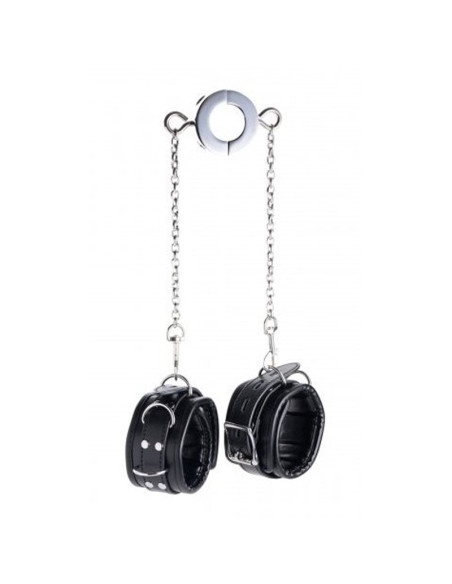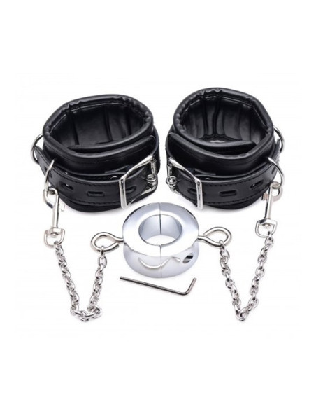 El anillo de acero de 3 cm de diámetro conecta directamente con las esposas a través de cadenas resistentes, garantizando que cuanto más se mueva el sumiso, más tirantez sentirá. Las esposas ajustables se adaptan perfectamente al tobillo mientras mantienen firmeza suficiente para asegurar la inmovilización, haciendo de este set una herramienta de sometimiento simple pero absolutamente eficaz.
