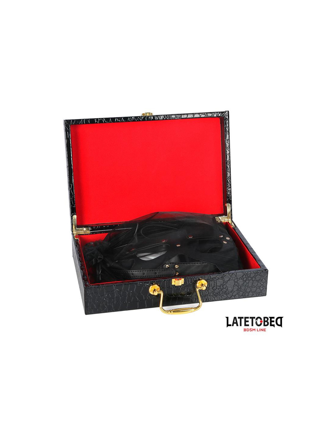 - Incluye: esposas para muñecas, esposas para tobillos, mordaza, pala, flogger, pinzas, máscara, collar con correa, maletín.