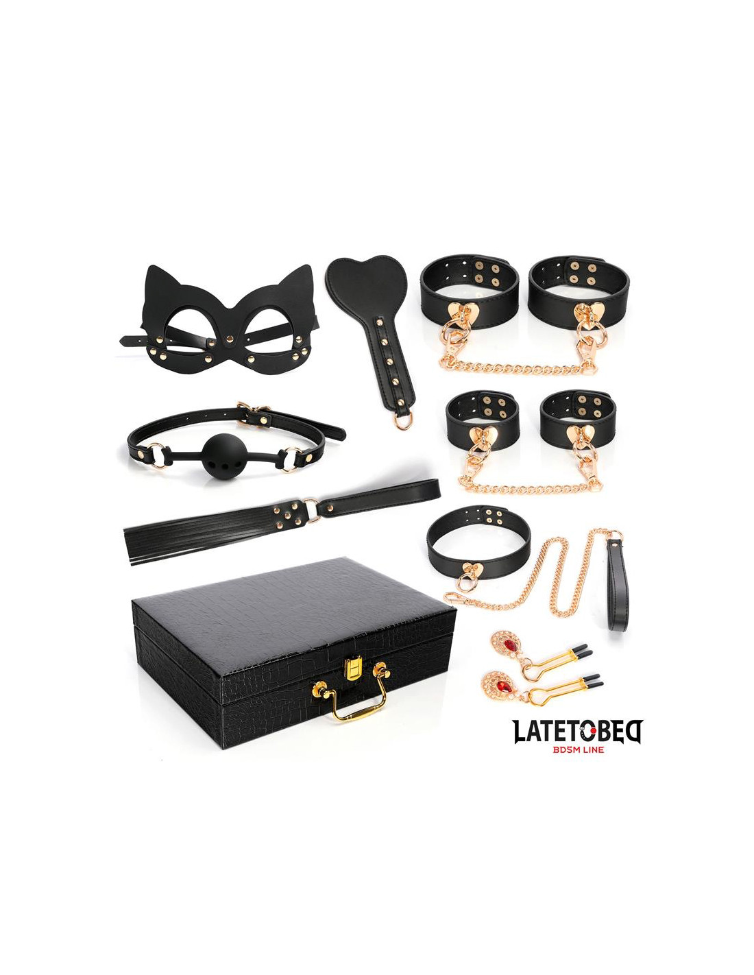 - Set completo de 8 piezas BDSM con diseño cuidado y acabados en dorado.