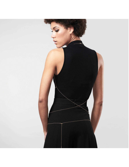 El Magnifique Bra Chain de Bijoux Indiscrets es una joya corporal diseñada para realzar la sensualidad con un enfoque elegante y sofisticado. Inspirado en las bailarinas de los cabarets neoyorquinos de los años 20, este accesorio transforma el cuerpo en una auténtica pieza de deseo.