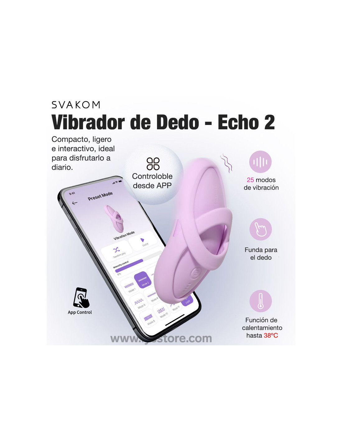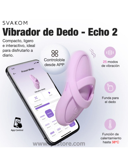 Pequeño, inteligente y tan potente como preciso. El Svakom Echo 2 convierte tu dedo en un auténtico generador de placer. Su diseño flexible con funda texturizada de silicona líquida ultrasuave se adapta perfectamente a tu mano, multiplicando la sensibilidad de cada caricia y transformando el juego en pura conexión sensorial.