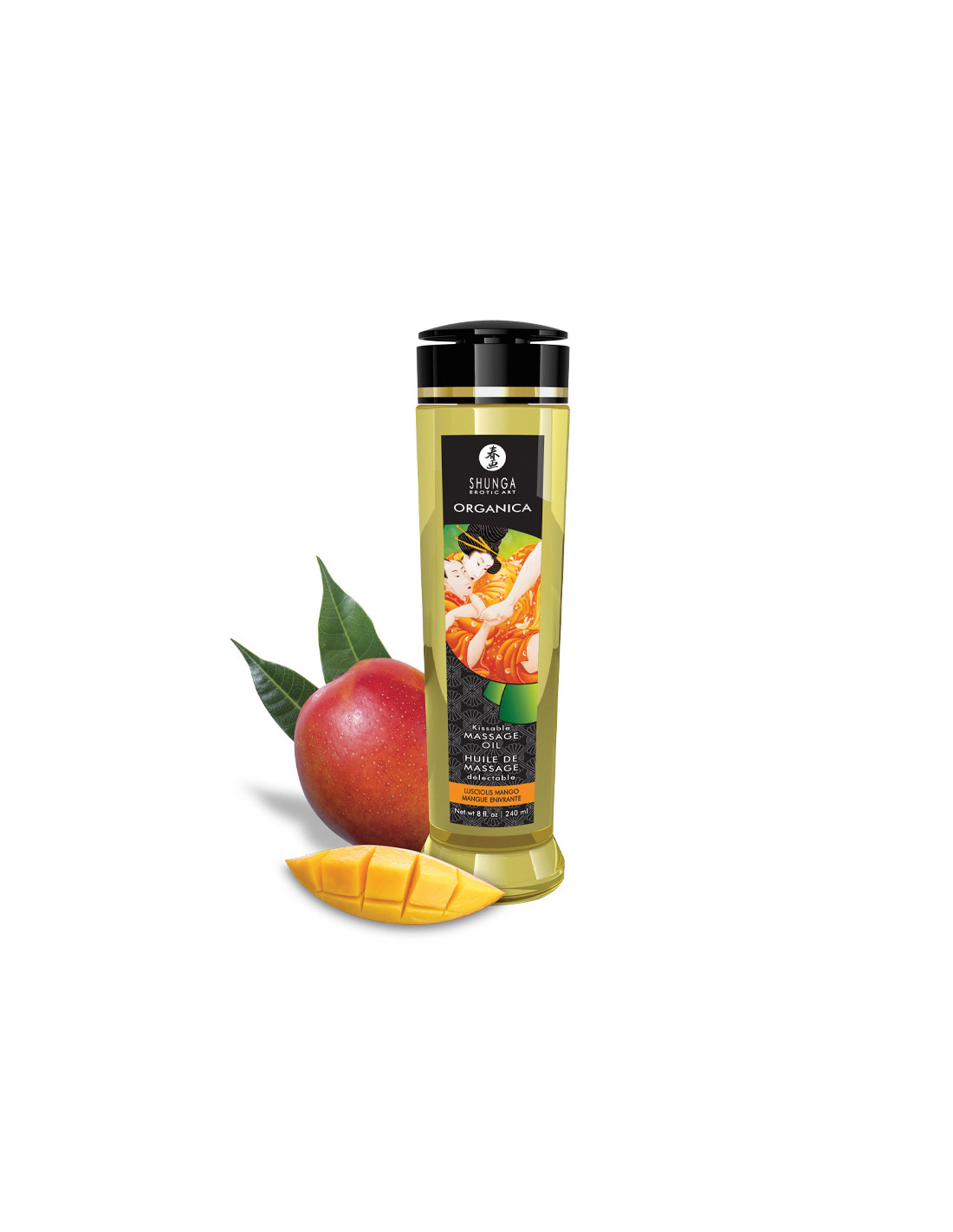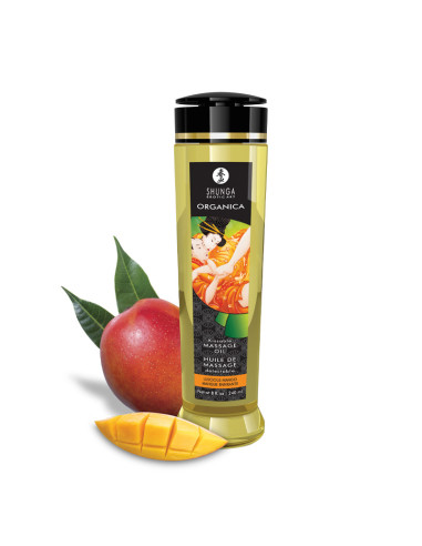 Aceite de masaje orgánico con aroma a mango. Textura sedosa, ideal para masajes relajantes y eróticos. Nutre la piel y prolonga el deslizamiento. Formato 240 ml.