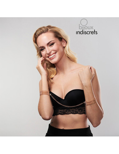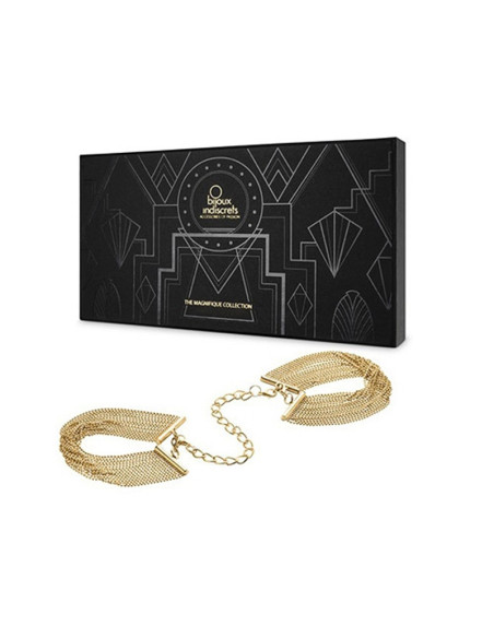 Descubre las esposas doradas Magnifique de Bijoux Indiscrets: pulseras elegantes convertibles en menottes BDSM. Ajustables, sin níquel y con diseño sofisticado.