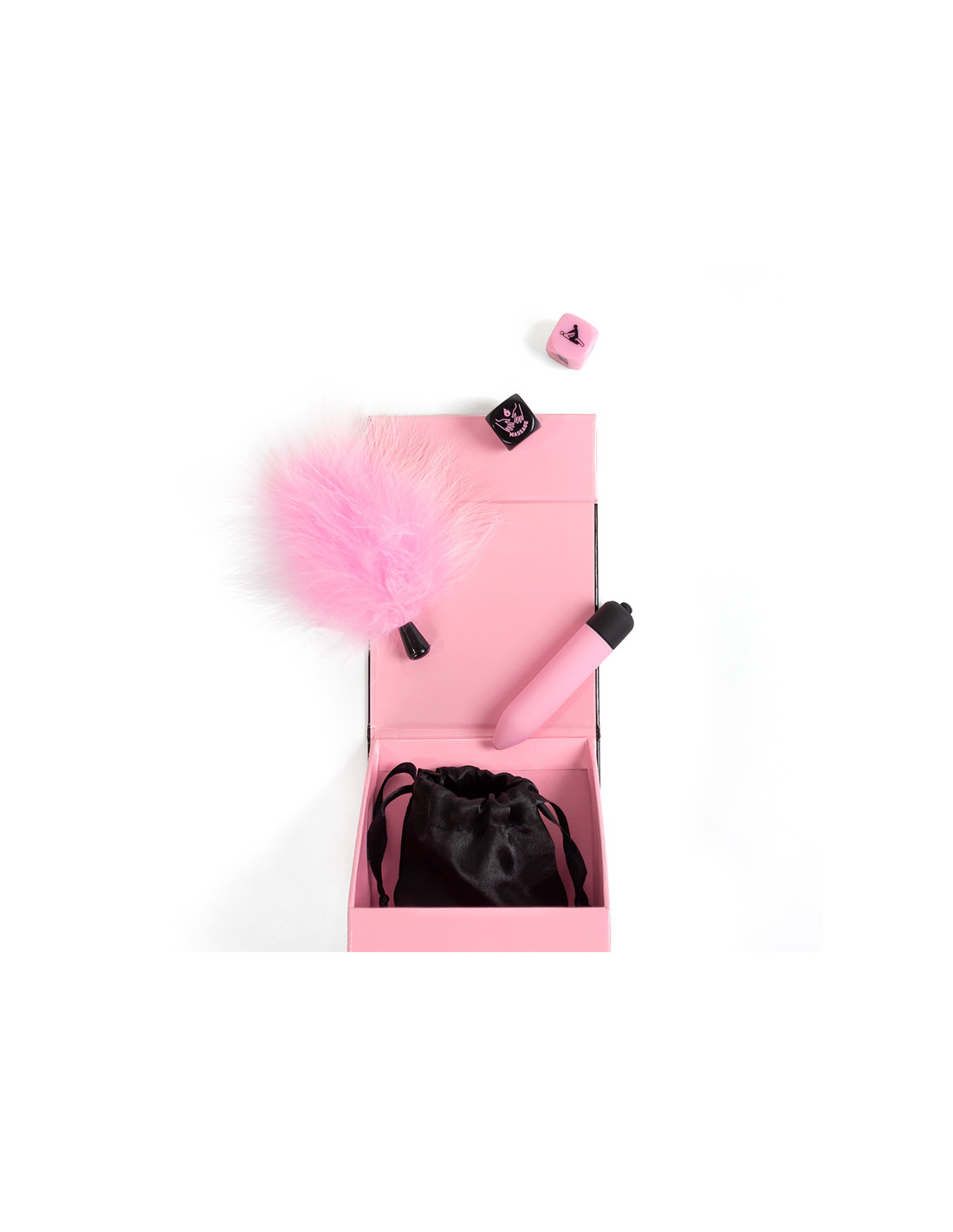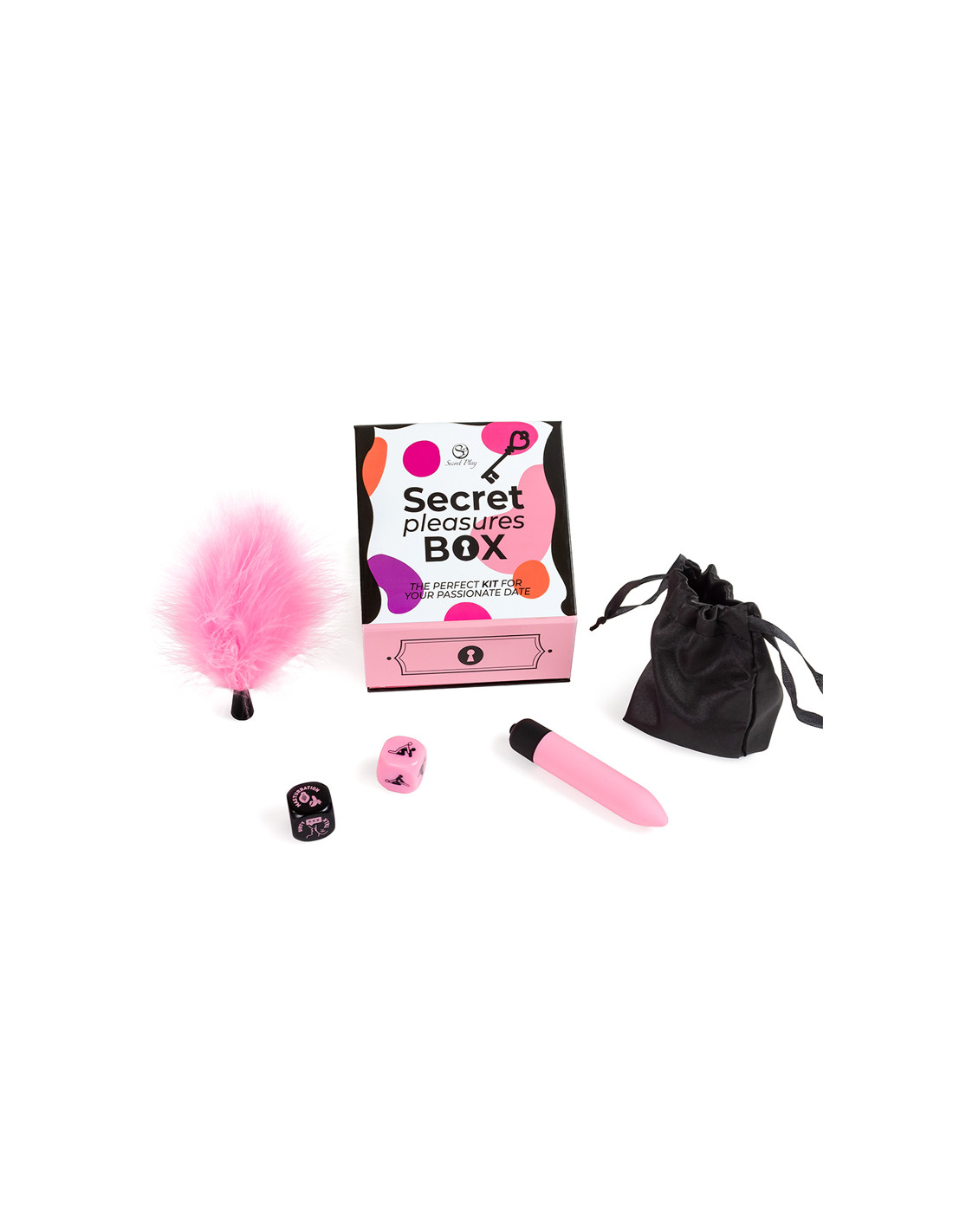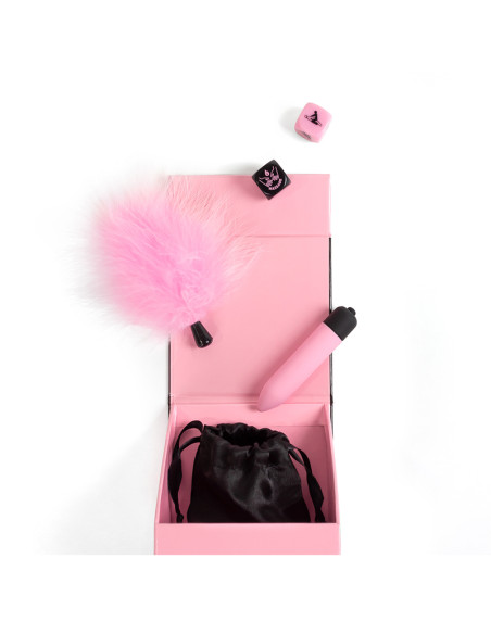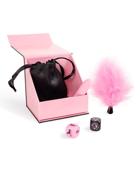 Descubre Secret Pleasures Box: kit erótico para parejas con bala vibradora, plumero, dados inclusivos y bolsa satinada. Ideal para juegos sensoriales, preliminares y sorpresas íntimas.